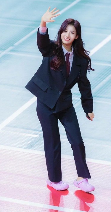 Twice Sana 出席活動時,穿上整套的西裝,搭配粉紅色的 Crocs 洞洞鞋